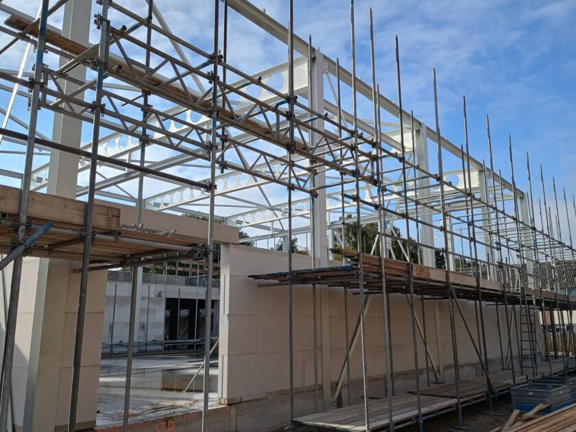 De bouw van het IKC en Appartementen De Poel te Langeraar schiet al mooi op en inmiddels zijn beide casco’s op hoogte.